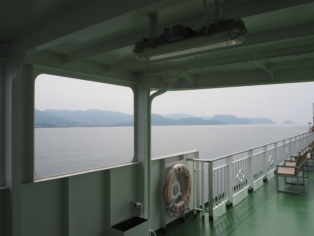 Sad to have missed it. On the other hand, the view from the southern side of the island was stunning enough even without the famed pumpkin. Cargo ships passed back and forth in the light blue sea with the tall, blue mountains of Shikoku forming a beautiful backdrop. Far away in the distance you could make out the skyline of Takamatsu, the capital of Kagawa prefecture, famed for udon (thick wheat noodles).